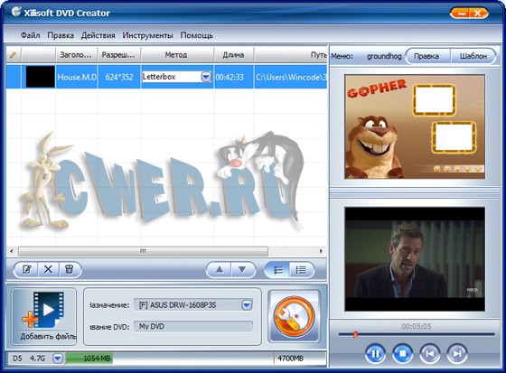 Xilisoft DVD Creator - программа для создания и записи (прожига) DVD с простым и удобным интерфейсом. Основные возможности: создание DVD с полноценными меню и субтитрами из AVI, MPEG, WMV, DV, DivX, Xvid, VOB, 3GP, 3G2, MP4 и других видеофайлов; выбор из имеющихся преднастроек или собственная настройка параметров видео, поддержка NTSC и PAL, поддержка соотношений картинки 4:3 и 16:9, предварительный просмотр результата, наконец, прожиг созданного проекта на DVD.