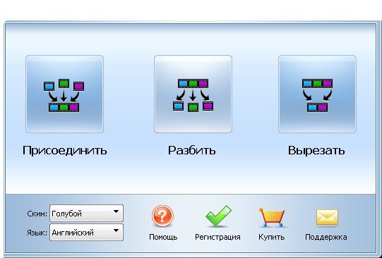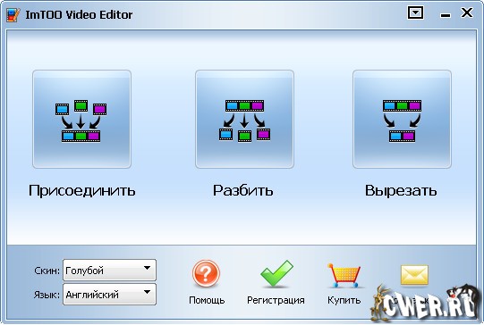 ImTOO Video Editor - соединяет, обрезает и разделяет различные типы видеофайлов. Программа поддерживает 3GPP и 3GPP2, AVI, файлы Macromedia Flash, QuickTime, MPEG4, RAW h264, файлы Windows Media и MPEG. Утилиту просто установить и использовать. При запуске открывается окно приложения с тремя кнопками. В зависимости от выполняемой задачи необходимо нажать на одну из них: Join (Соединить), Split (Разбить), Cut (Обрезать).