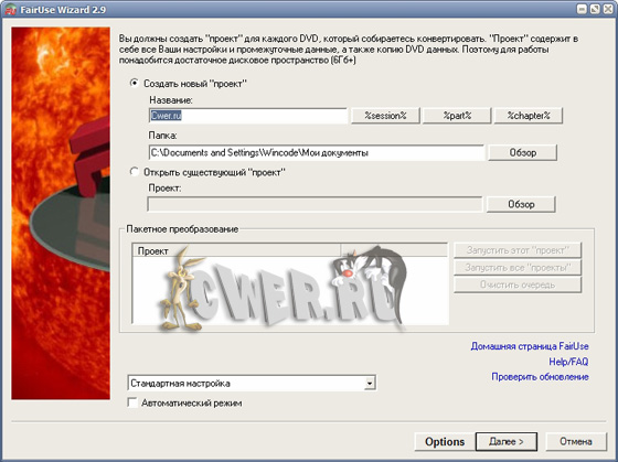 FairUse Wizard – отлично послужит Вам если Вы хотите копировать содержимое DVD диска на хард при этом перегнав его в высококачественное DivX или XviD видео. Программа поможет Вам рипать не только диски DVD, но и их iso-образы, использует, как свои встроенные кодеки, так и кодеки встроенные в систему. Иными словами, FairUse Wizard великолепный риппер DVD видео с возможностью преобразования в популярные видео форматы. FairUse Wizard обладает возможностью сжатия видео до 700 Мb а так же возможность работать как в автоматическом режиме, так и в режиме эксперта (где доступны различные настройки).
