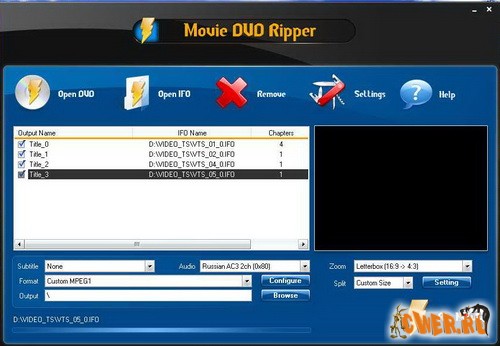 Программа для извлечения видео из DVD в DivX, AVI, MPEG, WMV, RM, MOV, XviD, MP4, 3GP, 3G2, ASF и другие видео форматы. Позволяет выбрать язык субтитров, разбить файл на куски указанного размера, задействовать звук Dolby Surround, выбрать битрейт аудио. Кроме этого, программа анализирует тип процессора и в зависимости от этого выбирает наилучшую скорость риппинга. Полностью задействует возможности последних процессоров и позволяет выполнять пакетное преобразование файлов.