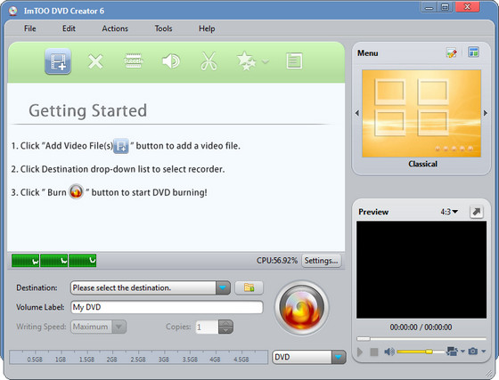 ImTOO DVD Creator – это отличная программа записи на DVD, которая может конвертировать все популярные видео форматы в DVD и записывать на DVD. Программа создания DVD позволяет вам определить NTSC или PAL форматы, настроить 4:3 или 16:9 видео коэффициент пропорциональности и записать на DVD диск или в ISO файл с видео файлов. Данная программа также предоставляет вам множество отличных DVD меню для авторизации DVD. Так что вы можете с легкостью использовать и быстрее чем раньше, просто один щелчок, чтобы создать и записать DVD.