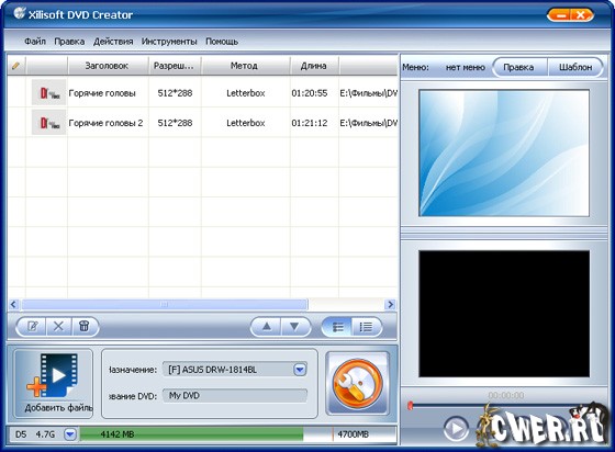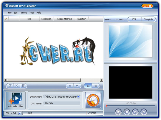 Xilisoft DVD Creator - программа для создания и записи (прожига) DVD с простым и удобным интерфейсом. С помощью этой программы вы сможете создавать DVD с полноценными меню и субтитрами из AVI, MPEG, DivX, DV, VOB, or WMV и других видеофайлов. Выбор из имеющихся преднастроек или собственная настройка параметров видео, поддержка NTSC и PAL, поддержка соотношений картинки 4:3 и 16:9, предварительный просмотр результата.