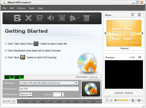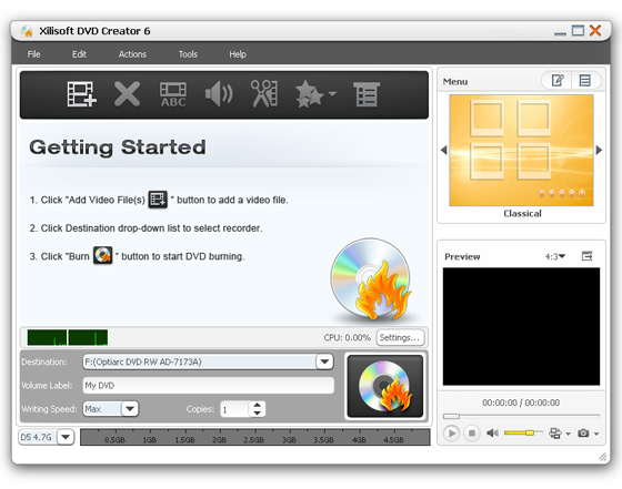 Xilisoft DVD Creator - программа для создания и записи (прожига) DVD с простым и удобным интерфейсом. Основные возможности: создание DVD с полноценными меню и субтитрами из AVI, MPEG, WMV, DV, DivX, Xvid, VOB, 3GP, 3G2, MP4 и других видеофайлов; выбор из имеющихся преднастроек или собственная настройка параметров видео, поддержка NTSC и PAL, поддержка соотношений картинки 4:3 и 16:9, предварительный просмотр результата, наконец, прожиг созданного проекта на DVD. В новой версии добавлена поддержка форматов видео высокой четкости, таких как MKV, TS, MOV, МТС, M2TS т.д.