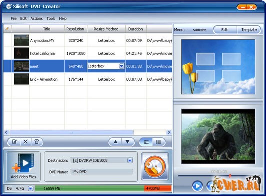 Xilisoft DVD Creator - программа для создания и записи (прожига) DVD с простым и удобным интерфейсом. Основные возможности: создание DVD с полноценными меню и субтитрами из AVI, MPEG, WMV, DV, DivX, Xvid, VOB, 3GP, 3G2, MP4 и других видеофайлов; выбор из имеющихся преднастроек или собственная настройка параметров видео - битрейда, фреймрейда, качества и других параметров DVD, поддержка NTSC и PAL, поддержка соотношений картинки 4:3 и 16:9, предварительный просмотр результата, наконец, прожиг созданного проекта на DVD. Возможно создание и запись на DVD ISО-образа. Поддерживаются DVD-R, DVD+R, DVD-RW, DVD+RW.