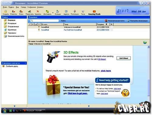 IncrediMail - очень оригинальная почтовая программа, причем главная ее особенность - не набор функций по обработке корреспонденции (хоть и их немало), а совершенно новые, не имеющиеся ни в одной из других почтовых программ, возможности по оформлению писем с помощью анимации, создания "прыгающего" текста, включения в текст графических смайликов и многого другого, включая самые разнообразные 3D-эффекты. Результатом всего этого станет то, что самое обычное письмо превратится в настоящее произведение искусства (если, конечно, вы не переборщите с эффектами) с вашей личной подписью - встроенный в программу редактор позволяет вытворять и не такое (кстати, эта опция может очень пригодиться для подготовки бланков "деловых" писем).