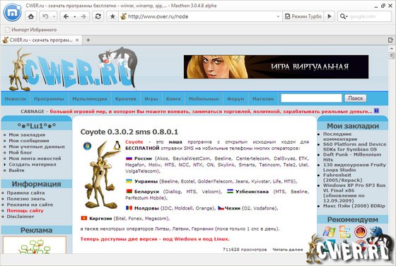 Maxthon - браузер поддерживающий вкладки и имеет собственный RSS-агрегатор, Maxthon также обладает множеством полезных функций, значительно повышающих удобство работы с браузером: поддержку жестов мыши и продвинутого перетаскивания объектов, базы данных форм для автозаполнения, горячие клавиши и псевдонимы для адресов, группы ссылок, фильтр рекламы, средства поиска и др. Функциональность Maxthon дополнительно расширяется плагинами.