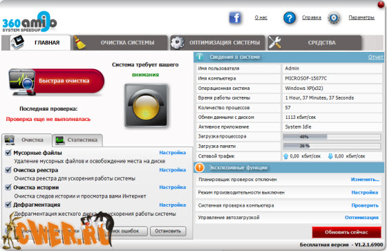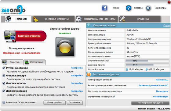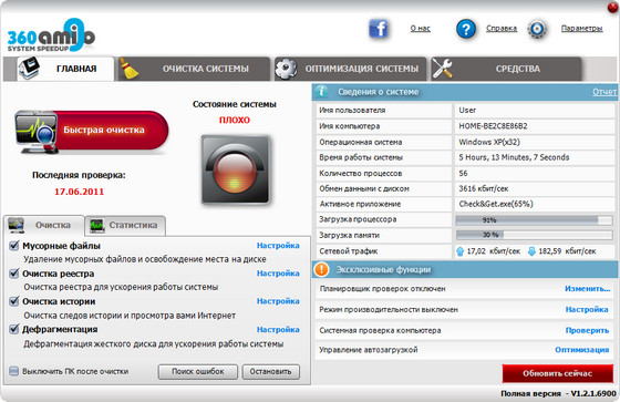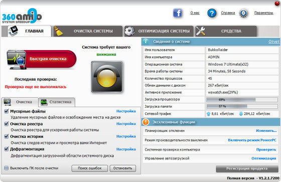 Думаете, что Ваш ПК слишком медленный? 360Amigo System Speedup может быстро вычислить и исправить широкий спектр ошибок и ускорит работу Вашего медленного ПК. 360Amigo System Speedup определяет и удаляет на Вашем компьютере все неиспользуемые файлы, оставшиеся от неправильной установки / удаления программ, он оптимизирует Ваш Windows, тем самым ускоряя время запуска системы. Кроме того, эта программа препятствует запуску вредоносных процессов на Вашем ПК. Также, она удаляет следы Вашей он-лайн активности, а именно историю просмотра, cookie-файлы, временные файлы, журнал регистраций, неверные ссылки и многое другое. Но самое главное в этой программе это то, что она мало весит, невероятно быстра и действенна (обычно её прогон занимает менее минуты). 360Amigo System Speedup выжмет максимум из Вашего ПК и сделает его снова как новым. Доступными функциями и возможностями этой программы смогут наслаждаться как новички, так и опытные пользователи.