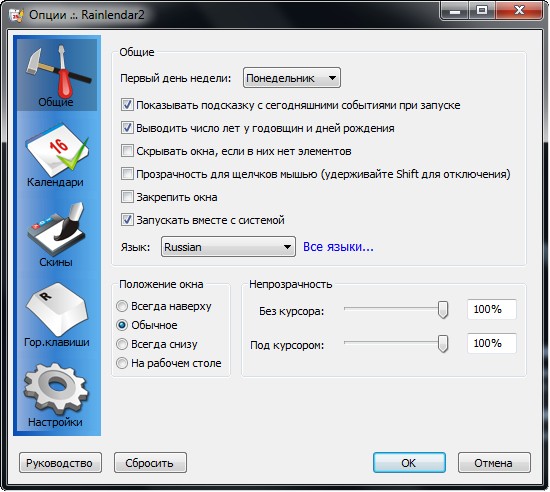 Rainlendar - календарь для рабочего стола, поддерживающий список задач на тот или иной день. Есть возможность переноса настроек из Microsoft Outlook. Возможна смена скинов и изменение уровня прозрачности. Поддерживаются плагины, горячие клавиши и многоязычный интерфейс.