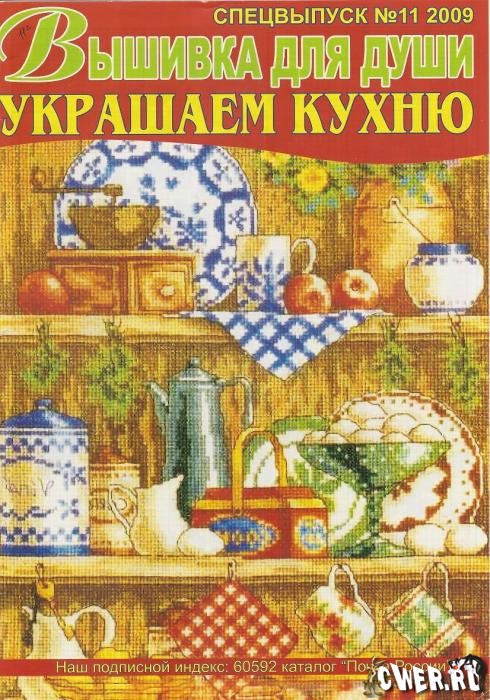 Журнал с цветными схемами для вышивки крестиком натюрмортов, кухонной утвари, узоров для рушников, работы по которым сделают вашу кухню уютной и неповторимой.