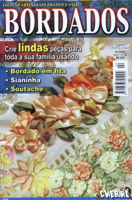 Бразильский журнал посвящен вышивке лентами. Первая половина журнала - это пошаговые уроки, а во второй представлены модели декорирования полотенец, одежды, сумки.