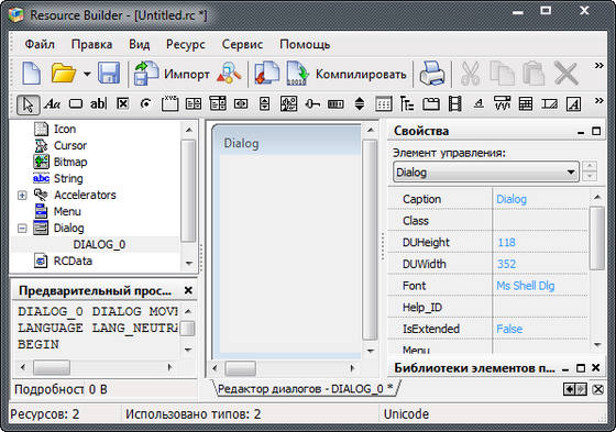 Resource Builder - профессиональный редактор ресурсов! Сегодня файлы ресурсов используются практически во всех разработках приложений, но редактирование ресурсов было всегда "непростой" задачей. Используя Resource Builder, редактирование ресурсов становится не просто простой - а простейшей задачей в процессе разработки.Этот редактор ресурсов предоставляет полный набор очень удобных и понятных визуальных редакторов для всех типов ресурсов, что позволит еще более ускорить процесс разработки программ. Кроме того программа имеет и Русский интерфейс , что позволит с ней работать даже не опытному пользователю.