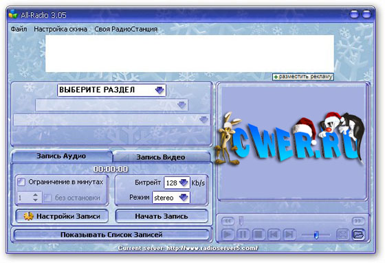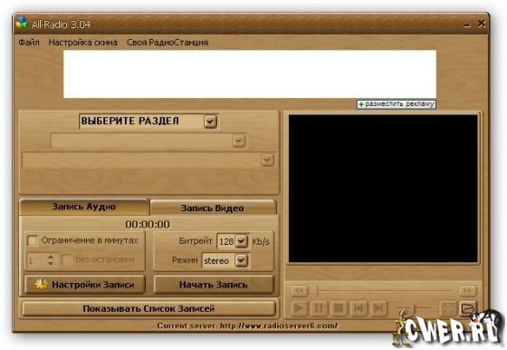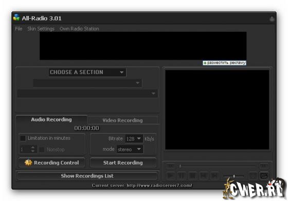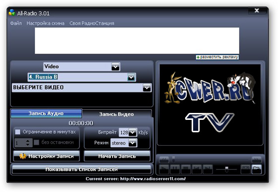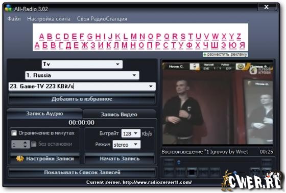 All-Radio - Программа для прослушивания радиостанций и просмотра ТВ-каналов, вещающих через интернет с возможностью записи аудио и видео потока. На сегодняшний день в программе собрано: радиостанций – 2498, ТВ-станций – 1121, видео – 135. При этом список их еженедельно обновляется (для пользователя обновление происходит автоматически при запуске программы). Все станции сгруппированы по странам, что делает их поиск наиболее удобным. В программе собраны практически все РАДИО и ТВ станции, вещающие на русском языке.