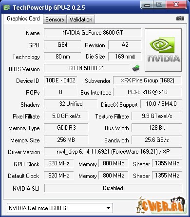 адаптере. GPU-Z поддерживает и карты NVIDIA, и ATI. Она поможет определить, какая у вас модель видеокарты, узнать интерфейс подключения, расскажет о том, какой используется графический процессор (версия BIOS, номер ревизии чипа, частота в 2D, 3D-режимах и при разгоне, сведения о поддержке DirectX). Кроме этого, GPU-Z предоставляет информацию о видеопамяти, а именно ее тип, объем, разрядность шины.