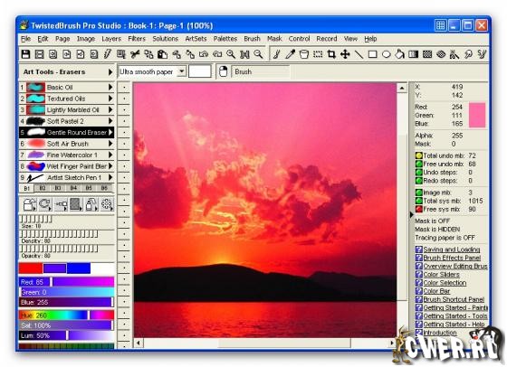 TwistedBrush Pro Studio - программа для художников. Она имеет большое количество самых разнообразных инструментов для рисования, от красок до мелков и карандашей. Эта программа глубоко поражает буквально с первого запуска. Интерфейсом Twisted-Brush мало похож на другие редакторы, хотя и предоставляет все необходимые возможности: работа с буфером обмена, зуминг и, конечно же, рисование. Причем рисующий инструмент только один — кисточка, зато количество (более 3000 штук!!!) и качество пресетов для рисования, а также многообразие форм и регулируемость размеров и цветовой гаммы позволяют человеку, не особо одаренному художественными талантами, буквально за пару минут изобразить то, что — возможно, более аккуратно и качественно, конечно — профессионал, работающий в другом редакторе, рисовал бы, наверное, не один час.