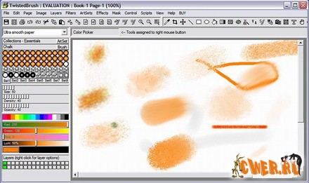 TwistedBrush Pro Studio 15.29 - графический редактор, "заточенный" под максимальное приближение к рисованию натуральными инструментами. Имеется полноценная эмуляция взаимодействия красок на холсте в зависимости от состава краски (масло, акварель, карандаш).