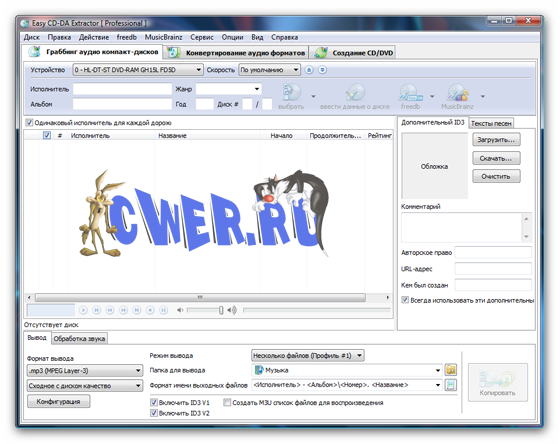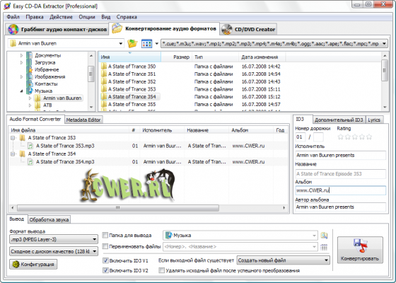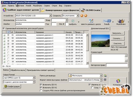 Easy CD-DA Extractor - программа для преобразования аудио-CD в качественные цифровые аудиофайлы, а также для записи MP3, WAV MP4, Windows Media Audio, FLAC, Ogg Vorbis, AAC и Monkey-s файлов на аудио-CD. Допускается преобразование аудиотреков непосредственно в MP3, WMA, VQF, OGG или WAV и конвертирование из одного аудиоформата в другой.