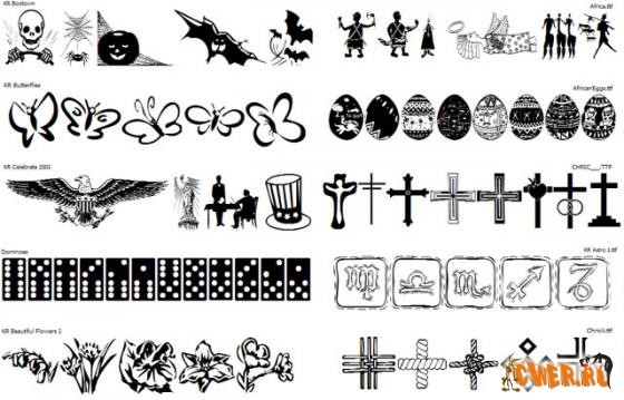 Подборка символьных шрифтов, разнообразной тематики: христианские символы, спорт, праздники, кельтские символы, цветы, знаки зодиака, животный мир, страшилки, музыка, орнаменты