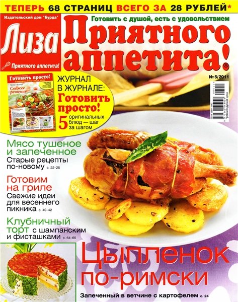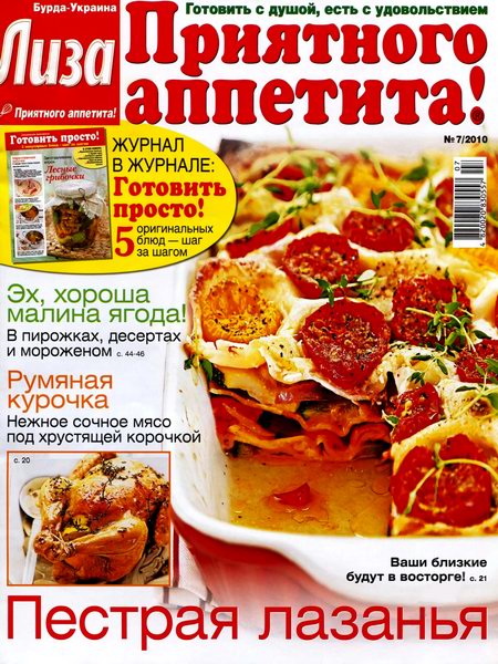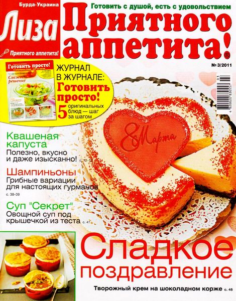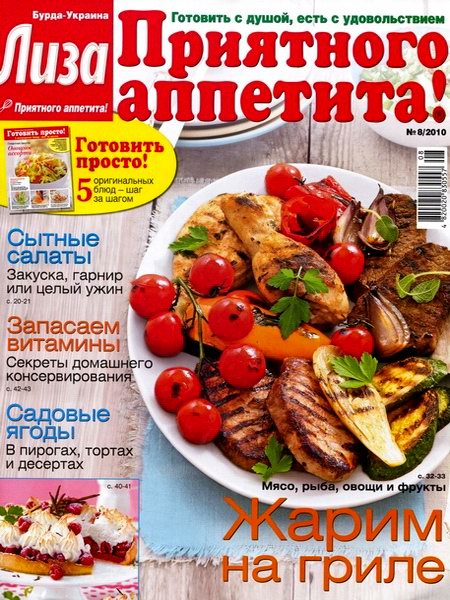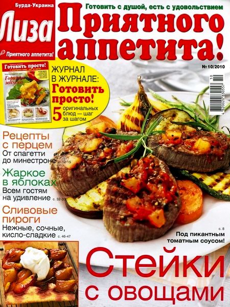 Журнал для тех, кто любит готовить, печь и радовать близких кулинарными сюрпризами. Издание предлагает яркий аппетитный мир всем, для кого готовить — радость, а есть — удовольствие. Это журнал, целиком посвященный только одной теме — домашней кулинарии. На страницах издания — лучшие рецепты русской кухни и самое вкусное со всего света, советы по приготовлению традиционных и экзотических блюд. Эффектный и несложный в исполнении, любой рецепт журнала может стать «фирменным» для любителя готовить дома. В журнале «Лиза. Приятного аппетита!» — рецепты от звезд, обеды для всей семьи, новинки из магазинов, аппетитные новости, школа поварят.