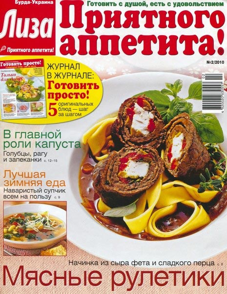 "Лиза. Приятного аппетита!" — журнал для тех, кто любит готовить, печь и радовать близких кулинарными сюрпризами. Издание предлагает яркий аппетитный мир всем, для кого готовить — радость, а есть — удовольствие. Это журнал, целиком посвященный только одной теме — домашней кулинарии.