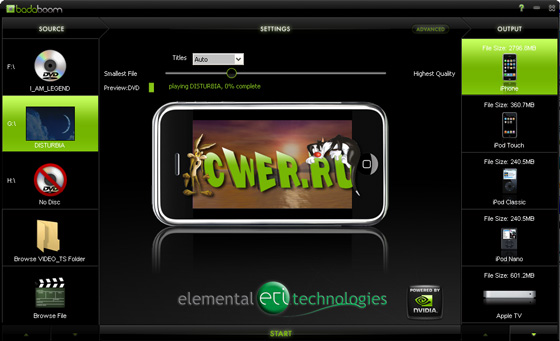 Badaboom Media Converter - первый в мире конвертер форматов, использующий технологии графических процессоров NVIDIA, позволяющий разгрузить основной процессор для других задач. Теперь нет причин для переноса просмотра фильма, обработки в Photoshop своих фотографий или других ресурсоемких заданий одновременно с конвертированием в AVCHD, ведь часть будет выполняться процессорами GPU. К сожалению данная программа рассчитана только на счастливых владельцев видеокарт на базе процессоров от NVIDIA поддерживающих технологию CUDA.