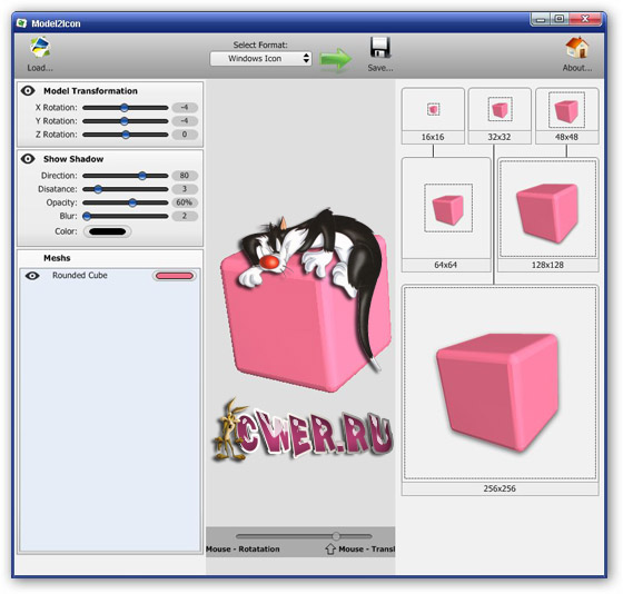 Model2icon конвертирует 3D модели в иконки Windows. Вы можете найти много 3D моделей в интернете и конвертировать их в значки для использования на Вашем рабочем столе, в приложениях и т.п. С model2icon Вы преобразуете 3D модель в иконку нескольким щелчками мыши. Программа поддерживает 3DS, MD3 форматы файла и значки Vista 256х256 с альфа каналом. Model2icon позволяет настроить 3D модель перед преобразованием.