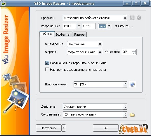 VSO Image Resizer - программа для изменения размеров графических картинок различных форматов - Jpeg, gif, bmp, tiff и др., а также форматов цифровых камер (Canon .CR2, Nikon .NEF , .MRW Minolta). Поддерживается сжатие файлов, конвертирование из одного формата в другой, вставка водяных знаков, использование шаблонов для переименования и многое другое. Возможна обработка графики в пакетном режиме. может встраиваться в оболочку Windows.