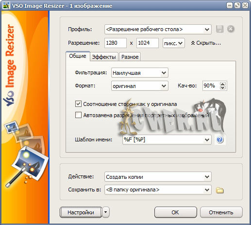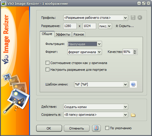 VSO Image Resizer - бесплатная программа, предназначенная для изменения размера изображений и конвертирования их в разные форматы. VSO Image Resizer пригодится тем, кому часто нужно уменьшить размер фотографий, например, для отсылки по электронной почте, а также для веб-мастеров или тех, кто собирается поместить изображения в интернете. Программа поддерживает форматы bmp, jpeg, gif, png. Если вы хотите конвертировать картинку для просмотра на iPod, Sony PSP, HDTV и DVD, просто выберите соответствующую заготовку, и программа сама преобразует изображения в нужный формат.