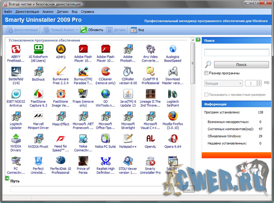 Smarty Uninstaller 2009 - обеспечивает решение задач по деинсталляции приложений, установленных на вашем компьютере. Программа является альтернативой стандартной утилите Windows, при этом имеет ряд преимуществ. Может показывать соответствующие значки приложений, дополнительную информацию о каждой установленной программе, а также есть функция поиска приложения по ключевому слову, автоматическое или ручное обнаружение и удаление неисправных ключей реестра. Smarty Analyzer тщательно просканирует компьютер и удалит файлы, оставшиеся от уже удаленных программ.