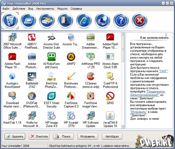 Your Uninstaller! обеспечивает решение задач по деинсталляции приложений, установленных на вашем компьютере. Он служит заменой стандартному диалогу Добавить/Удалить Windows.Показывает соответствующие значки приложений. Имеется функция поиска приложения по ключевому слову.Your Uninstaller! автоматически обнаруживает неисправные ключи реестра и полностью удаляет их по вашему разрешению. Возможно ручное удаление записей об установленных программах из системного реестра. Программа имеет хорошо продуманный и организованный интерфейс.