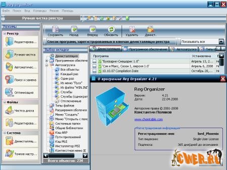 Reg Organizer - это многофункциональная программа для чистки реестра и его обслуживания, а также работы с конфигурационными файлами. Позволяет просматривать и редактировать системный реестр, осуществлять предварительный просмотр импортируемых reg-файлов (в том числе и из Проводника). Функция поиска в реестре предоставляет возможность производить глубокий поиск в реестре, находя все ключи, относящиеся к интересующему приложению. Также Reg Organizer поддерживает функции управления конфигурационными файлами различных типов.
