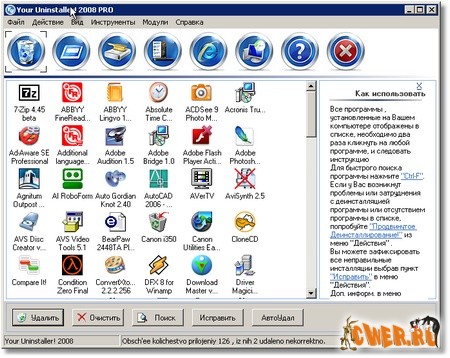 Обеспечивает решение задач по деинсталляции приложений, установленных на вашем компьютере. Он служит заменой стандартному диалогу Добавить/Удалить программу Windows. При этом работает приблизительно в 5-10 раз быстрее. Может показывать соответствующие значки приложений. Имеется функция поиска приложения по ключевому слову. Your Uninstaller! автоматически обнаруживает неисправные ключи реестра и полностью удаляет их по вашему разрешению. Возможно ручное удаление записей об установленных программах из системного реестра.