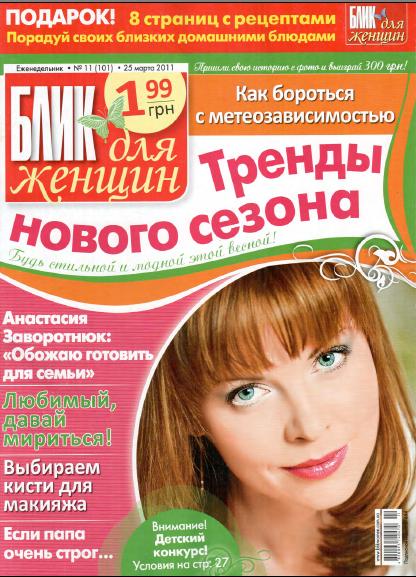Небольшой журнальчик, который пишет обо всем, что интересует современных девушек и женщин: о новинках моды, красоте, отношениях между полами и поколениями, отдыхе, жизни звезд, кулинарии.