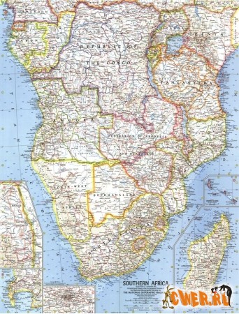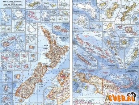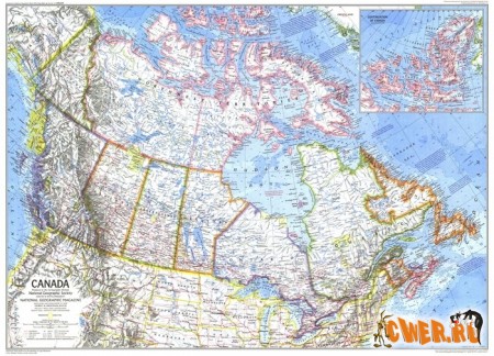 Физическая карта мира от научного общества National Geographic. Карта в разрешении 6000x4194. Содержит имена всех вершин, морских и океанических впадин, с указанием их высот и глубин соответственно.