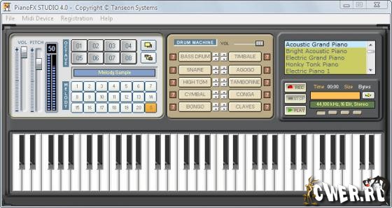 PiаnоFX Studiо 4.0 - программа-синтезатор, превращающий ваш компьютер в мощный синтезатор без использования MIDI-клавиатуры. Вы можете играть на виртуальной клавиатуре с помощью мыши и буквенных клавиш. Программа синтезирует звучание 127 инструментов, имеет drum-машину, может записать Ваши произведения в wav или midi формате.