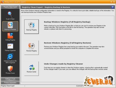 Registry Clean Expert - обновленная программа для сканирования реестра на предмет неправильной или устаревшей информации. Благодаря изменению таких данных в реестре система начинает работать быстрее и без ошибок. Включает в себя модуль поиска "шпионских" модулей. Registry Clean Expert имеет опцию резервного копирования и восстановления реестра на случай, если система даст сбой. Кроме этого, используя эту программу, вы можете управлять приложениями, которые запускаются вместе с Windows и Internet Explorer.