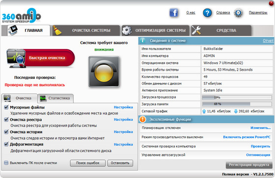 Думаете, что Ваш ПК слишком медленный? 360Amigo System Speedup может быстро вычислить и исправить широкий спектр ошибок и ускорит работу Вашего медленного ПК. 360Amigo System Speedup определяет и удаляет на Вашем компьютере все неиспользуемые файлы, оставшиеся от неправильной установки / удаления программ, он оптимизирует Ваш Windows, тем самым ускоряя время запуска системы. Кроме того, эта программа препятствует запуску вредоносных процессов на Вашем ПК. Также, она удаляет следы Вашей он-лайн активности, а именно историю просмотра, cookie-файлы, временные файлы, журнал регистраций, неверные ссылки и многое другое. Но самое главное в этой программе это то, что она мало весит, невероятно быстра и действенна (обычно её прогон занимает менее минуты). 360Amigo System Speedup выжмет максимум из Вашего ПК и сделает его снова как новым. Доступными функциями и возможностями этой программы смогут наслаждаться как новички, так и опытные пользователи.