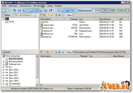 UltraISO - программа для работы с образами дисков в формате *.iso. Она позволяет редактировать содержимое CD-образа, извлекать и запускать имеющиеся на нем файлы. Программа делает ISO файл с CD-ROMа или жесткого диска. Ultra ISO работает не только с файлами в формате ISO, но и с образами, созданными в таких популярных программах, как Alcohol 120%, Nero, NTI CD/DVD Maker, Virtual CD, Clone Cd, BlindWrite и др. Ultra ISO может работать в паре с Nero Burning Rom и использовать движок этой программы для записи дисков.