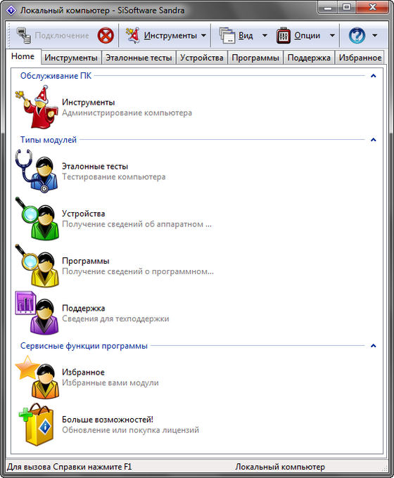 SiSoftware Sandra - системный анализатор для 32-х и 64-битных версий Windows, включающий в себя тестовые и информационный модули. Sandra старается превзойти другие подобные утилиты и показать реальную картину, объединяя в одной программе возможности для сравнения производительности как на высоком, так и на низком уровне. Вы можете получить сведения о процессоре, чипсете, видеоадаптере, портах, принтерах, звуковой карте, памяти, сети, Windows, AGP, соединениях ODBC, USB2, Firewire, и других.