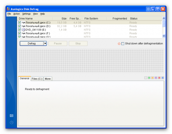 Auslogics Disk Defrag - это компактный и быстрый дефрагментатор, работающий как с FAT 16/32, так и с NTFS файловыми системами. Программа использует ряд алгоритмов, которые позволяют оптимизировать и упорядочить файлы Вашего жесткого диска, дефрагментировать файловую структуру и ускорить работу приложений и Windows.