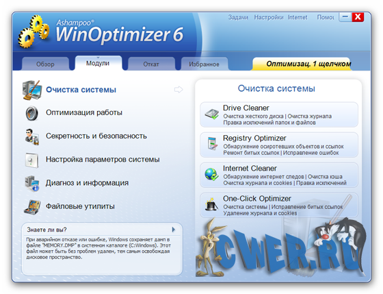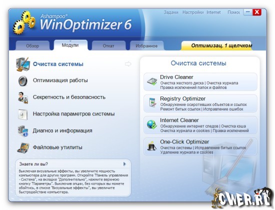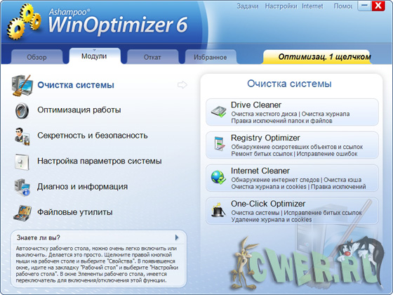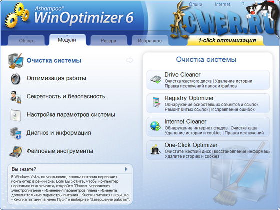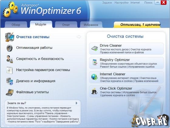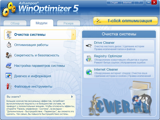 WinOptimizer - пакет программ, позволяющий оптимизировать операционную систему за счет ее настройки и очистки. Включает в себя утилиты для очистки жесткого диска и системного реестра, модуль для обеспечения защиты личной информации путем поиска и удаления файлов и данных, оставшихся после интернет-cepфингa, утилиту для оптимизации Интернет-соединения путем настройки Windows TCP/IP, модуль для настройки программ, автозагружаемых одновременно с запуском системы, а также модули для поиска и удаления ненужных файлов DLL, для безвозвратного удаления данных и для шифрования файлов. Кроме этого, Ashampoo WinOptimizer позволяет переназначать ассоциации файлов, шифровать/расшифровывать файлы, а также безвозвратно их удалять. Наконец, возможна настройка параметров системы и ее оптимизация за один клик - за это отвечает модуль “1-Click Optimization”.