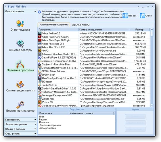 Super Utilities - сборник полезных утилит, при помощи которых вы сможете наладить, очистить и ускорить работу своей операционной системы. Пакет утилит служит для ежедневного использования и позволяет производить поиск и удаление ненужных файлов, очистку и оптимизацию системного реестра, имеет менеджер автозагрузки, а также позволяет производить защиту папок, резервное копирование, анализ папок. Также программа имеет средство для полного удаления ставших ненужными программ, менеджер процессов, менеджер конфиденциальности Internet Explorer и многое другое. В программе имеется простой пользовательсий интерфейс с мультиязычной поддержкой, а также имеется поддержка смены скина интерфейса. Работает на платформах Windows 98/Me/2000/XP/2003/Vista.