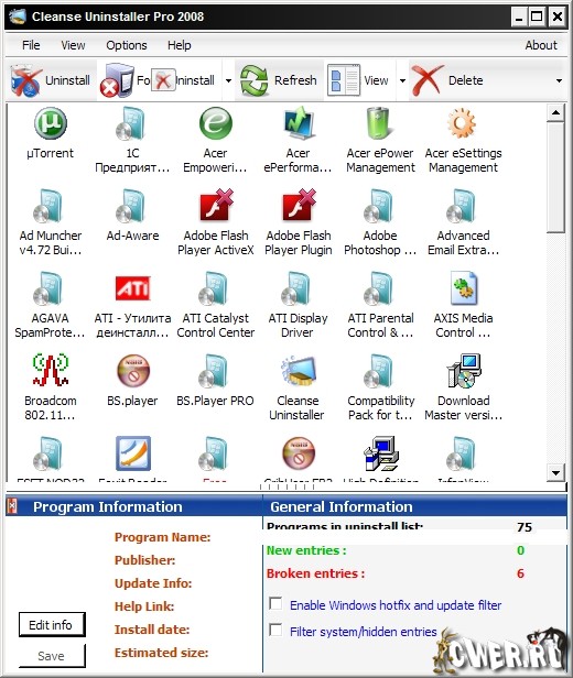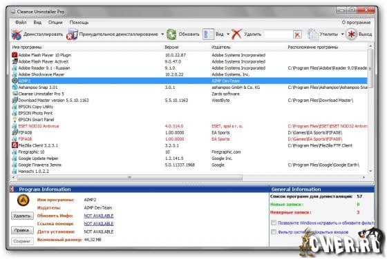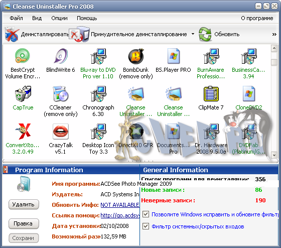 Программа для замены стандартного деинсталлятора Windows. Cleanse Uninstaller отображает список установленных программ с полной информацией, которая берётся напрямую из реестра. Работает продуктивнее стандартного деинсталлятора Windows, имеет небольшой размер дистрибутива и очень простой интерфейс. Также программа оптимизирует загрузку системы в целом и, по словам разработчиков, может успешно удалять модули Adware/Spyware.