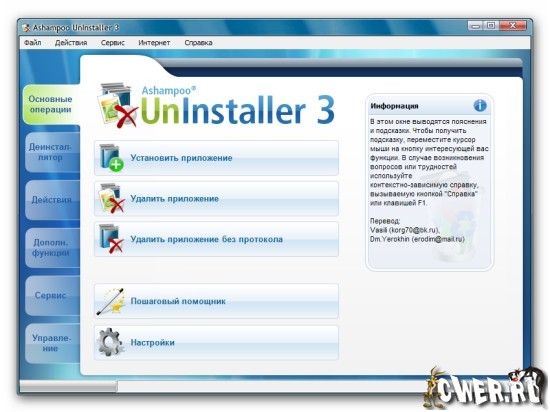 Ashampoo UnInstaller отслеживает и регистрирует изменения, которые вносят инсталляционные программы, что позволяет при необходимости корректно - то есть полностью - удалить ненужную программу. Положительным качеством является то, что UnInstaller удаляет не только те приложения, что были установленны с ее помощю, но и путем анализа деинсталлирует программы, мониторинг которых не производился. Кроме своей основной функции программа может: искать и удалять пустые папки; одинаковые и временные файлы; просматривать список всех установленных в системе шрифтов и удалять ненужные; удалять временные файлы Интернета, 'кэшированный' контент, файлы cookies, адреса сайтов введенные в ручную.