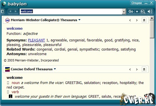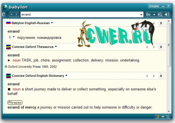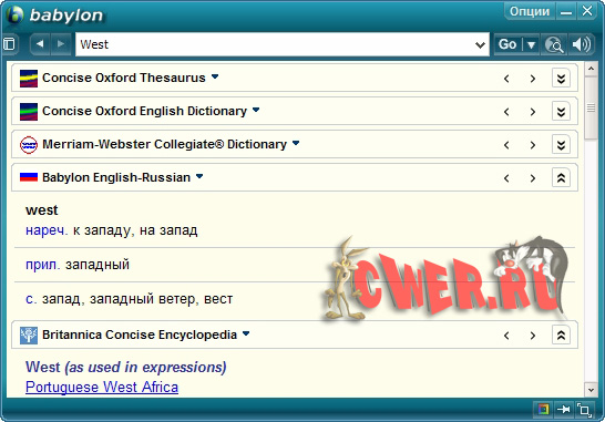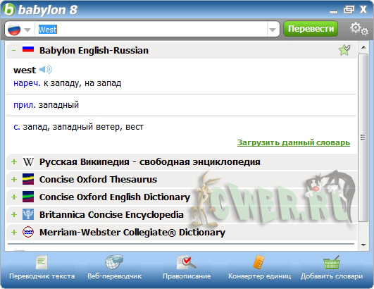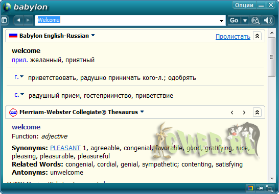 Babylon - словарь, позволяющий переводить слова с одного языка на другой. Работать со словарем очень просто: после нажатия кнопкой мыши на интересующее слово появляется окно с его переводом. Кроме перевода слов, Babylon включает в себя английские тематические и толковые словари, а также имеет функции конвертирования валют на текущую дату и перевода мер из одной системы в другую. Кроме словаря, который можно использовать в любое время, при онлайн-работе (т.е. во время подключения к Интернету) Babylon позволяет воспользоваться огромными базами данных, сосредоточенными в таких глоссариях, как Britannica, Amazon, Accuweather и др.