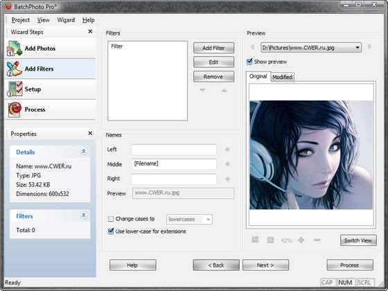 BatchPhoto Pro - помощь начинающему фотографу справиться с коррекцией фотографий и не задумываться об установке сложных в работе программ вроде фотошопа. По словам разработчика, всего за одну операцию можно легко подкорректировать или выправить картинку, применить эффекты (более 30), а также пакетно переименовать до нескольких тысяч файлов. Все просто - выделяете группу картинок и правите их одним махом все вместе.