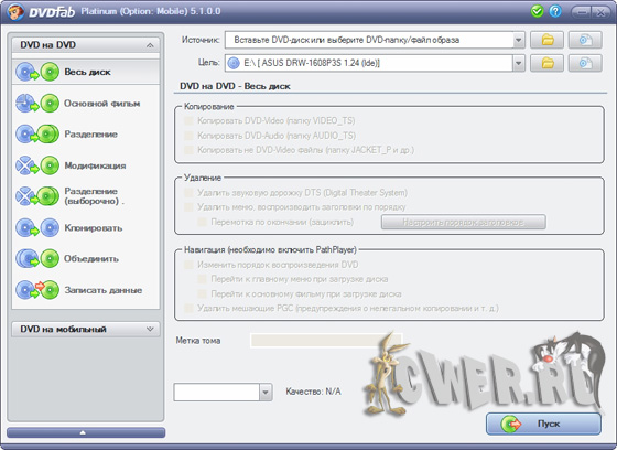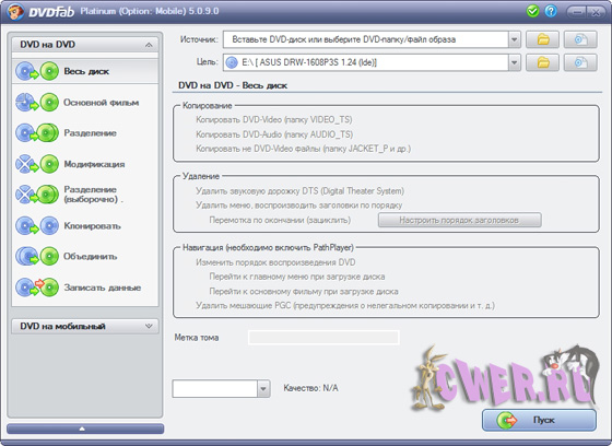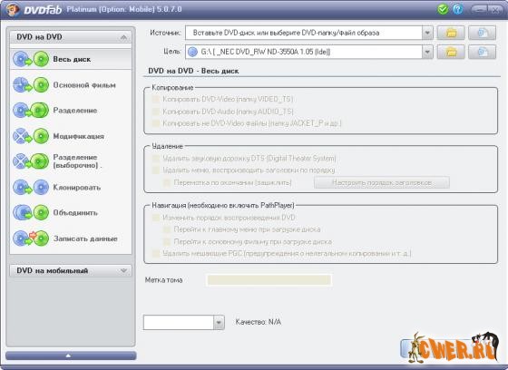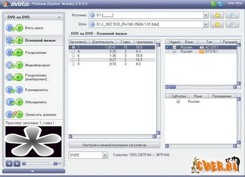 DVDFab Platinum – мощный, многофункциональный программный продукт для копирования DVD дисков с возможностями гибкой обработки видеопотока. Программа является одной из лучших на сегодняшний день, из инструментов для копирования, разбиения, пережатия и конвертирования DVD дисков с фильмами. Снимает все защиты и ограничения с диска и при желании пережмет диск большой емкости и вместит его в обыкновенную пустую DVD болванку с минимальными потерями качества (DVD9->DVD5) или разобъет фильм на два диска с полным переносом его меню, удалит всю рекламу, запишет только фильм и многое другое. Программа имеет интуитивно понятный, мультиязычный интерфейс включая русский.