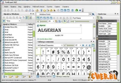 FontExpert - пожалуй, одна из лучших программ своего класса, для просмотра и установки шрифтов, а также проверки системы на наличие проблем со шрифтами. FontExpert отображает гарнитуры установленных шрифтов, а также позволяет пролистывать папки и предварительно просматривать гарнитуры шрифтов, находящихся на жестком диске, на сетевых устройствах, на CD или DVD дисках или дискетах. Шрифт можно просмотреть в виде текста, отформатированного выбранным шрифтом, в виде таблицы символов или образца шрифта. Можно выбирать размер шрифта, его стиль и цвет.