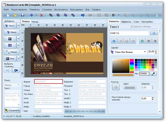 BusinessCards MX - программа для создания и проектирования визиток. При помощи этой программы Вы легко и быстро спроектируете и распечатаете профессиональные визитки. Интерфейс программы спроектирован так, чтобы даже у начинающего пользователя не было проблем с обслуживанием программы. Процесс проектирования заключается во вставке готовых доступных в программе элементов таких, как текст, фигуры, изображения и фон, а также произвольном их перемещении на разрабатываемом проекте. Программа использует шаблоны визиток, которые можно подготовить самому или использовать готовые образцы визиток, доступные в программе. В программе доступны около 400 образцовых шаблонов визиток.