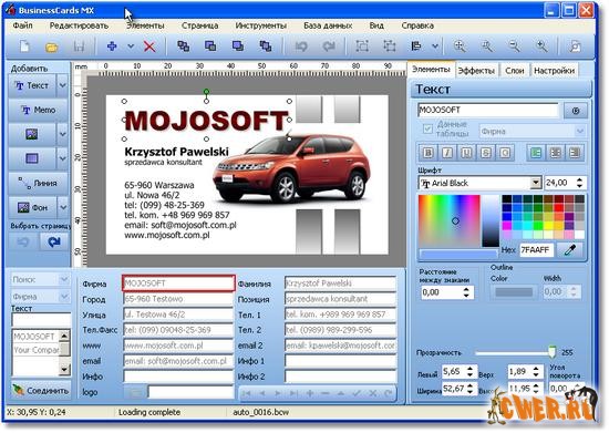 BusinessCards MX - программа для создания и проектирования визиток от польского разработчика. При помощи этой полезной программы вы легко и быстро спроектируете и распечатаете профессиональные визитки. Интерфейс программы спроектирован так, чтобы даже у начинающего пользователя не было проблем с использованием данной программы. Процесс проектирования заключается во вставке готовых доступных в программе элементов таких, как текст, фигуры, изображения и фон, а также произвольном их перемещении на разрабатываемом проекте. Программой используются шаблоны визиток, которые можно подготовить самому или использовать готовые образцы визиток, доступные в программе. Интерфейс имеет многоязычную поддержку, включая поддержку русского языка.