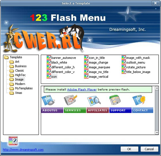 123 Flash Menu - мощный инструмент для создания внушительного и профессионального меню за 3 шага. Сотни предсозданных шаблонов помогают Вам осуществлять персонифицированное меню. Это дает вам динамические эффекты подобно анимации, звукам, градиенту и прозрачности без навыков программирования. Программа предлагает многоуровневое меню Flash с полностью настраиваемым текстом, шрифтом, связью, фоном, стилем границы, теневым стилем и прочими эффектами. Содержит в себе более 100 готовых шаблонов.